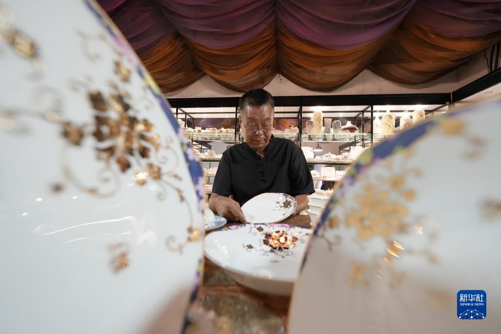 9月12日,戴佩維在整理陶瓷雕金作品。