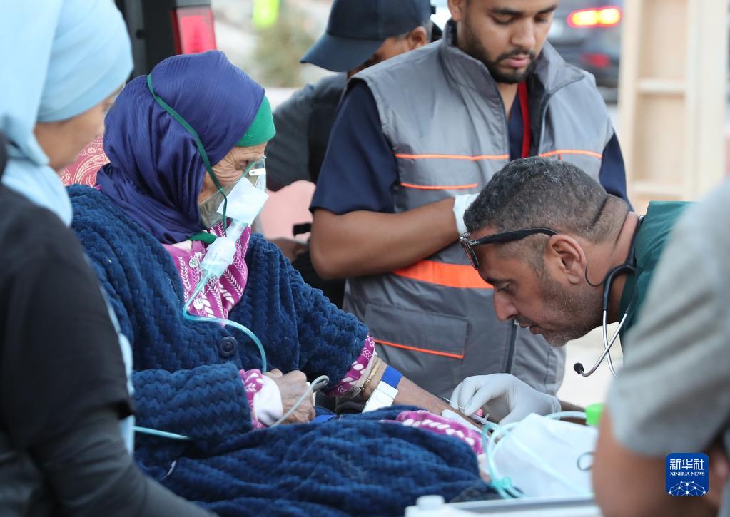 9月12日,在震中區域的摩洛哥豪茲省塔拉特恩雅庫布村,救援人員救治一名受傷的老人。