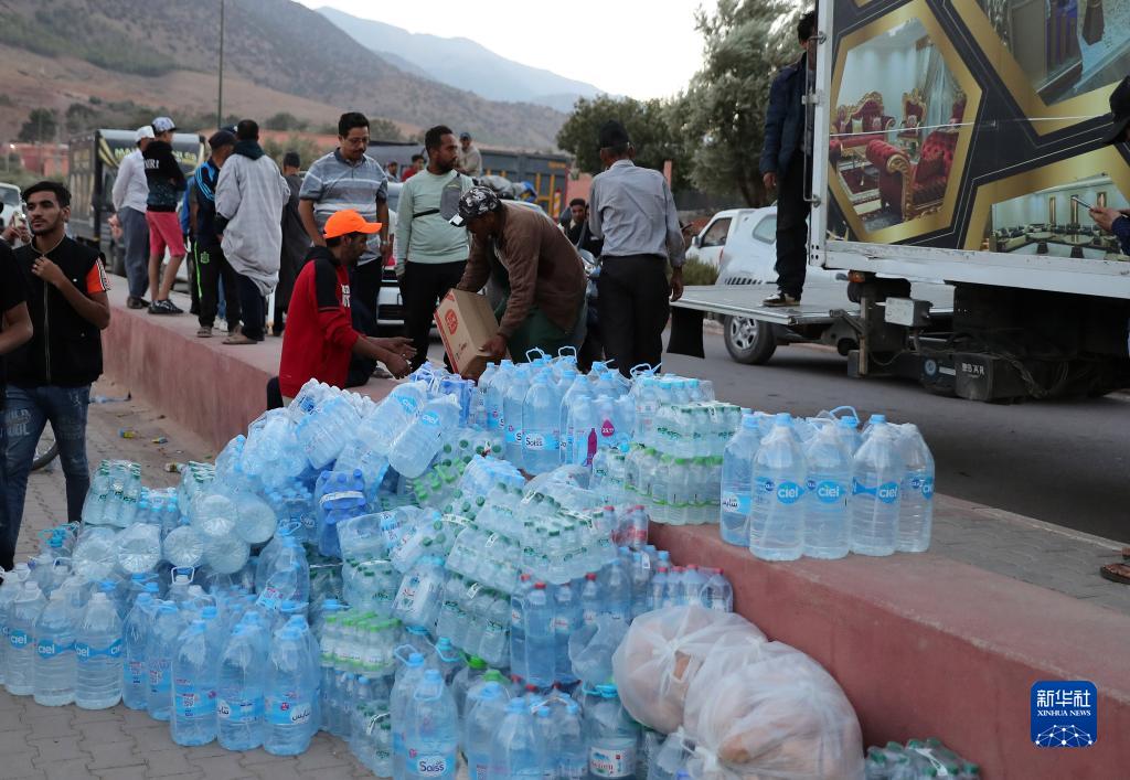 9月12日,救援人員在摩洛哥豪茲省的塔拉特恩雅庫布搬運物資。