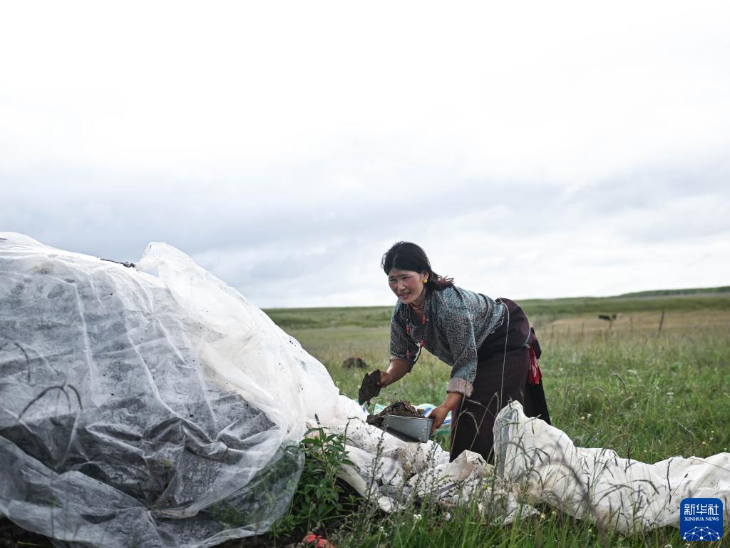 8月17日,在青海省黃南藏族自治州河南蒙古族自治縣多松鄉多松村,扎西曲培的妻子斗格吉在撿拾牛糞。新華社記者 張龍 攝