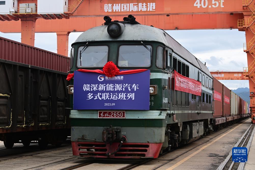 9月13日,在江西贛州國際陸港,贛深新能源汽車多式聯運專列準備啟程開往深圳鹽田港。