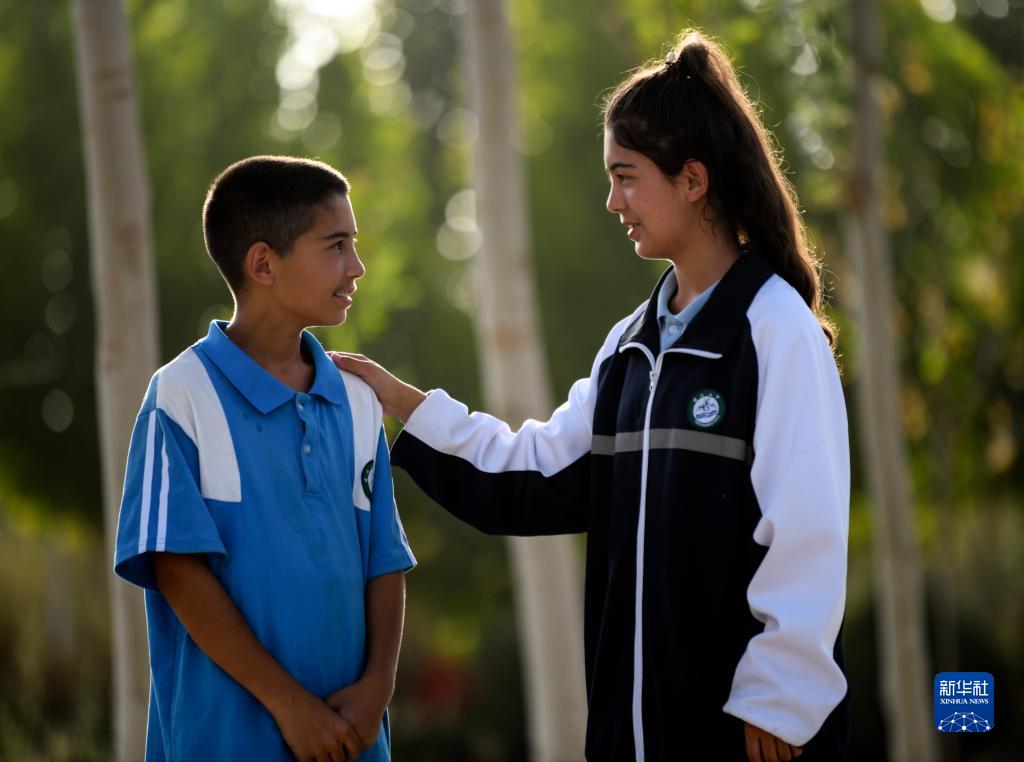 9月7日,在新疆喀什第二中學院內,拉齊尼的女兒都爾汗·拉齊尼和她的弟弟拉迪爾·拉齊尼聊天,姐姐鼓勵弟弟要好好學習。新華社記者 王菲 攝