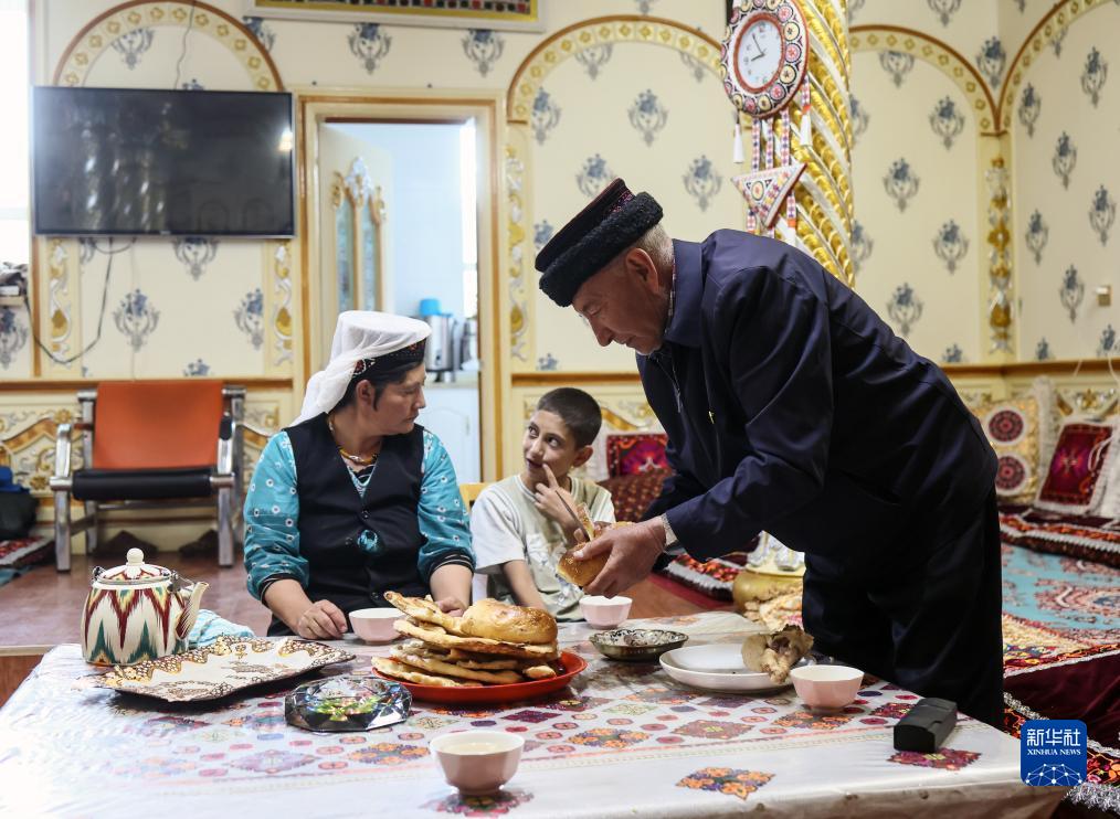 9月5日,巴依卡老人和家人在一起吃晚飯。新華社記者 蘭紅光 攝
