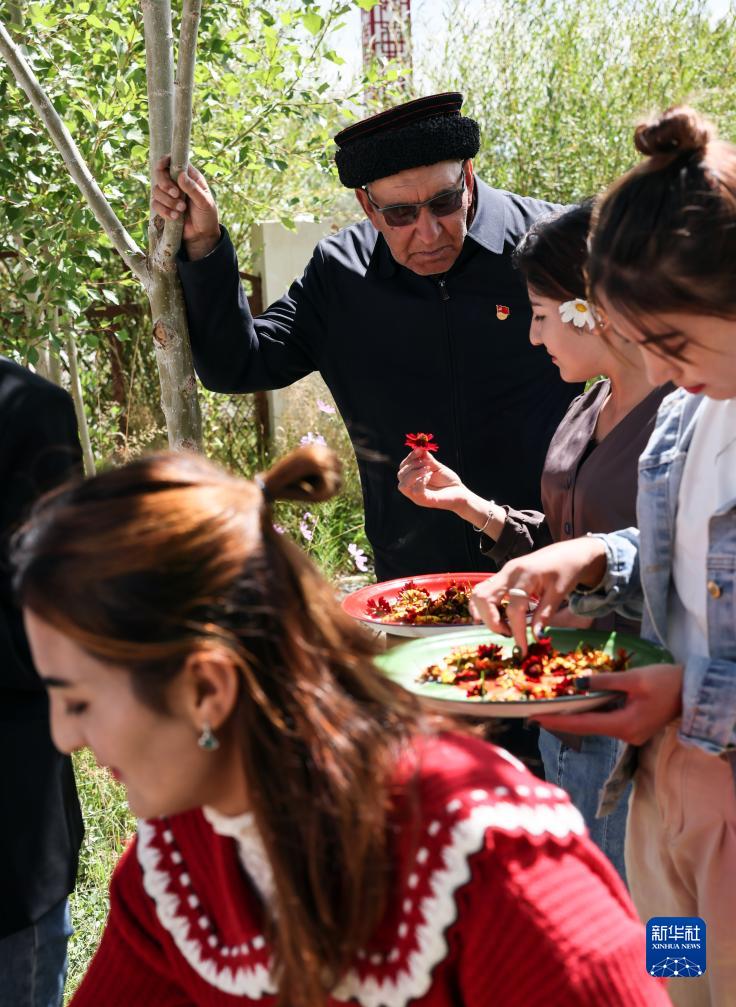 9月4日,村里的年輕人前來巴依卡老人家中,幫助他采摘家里種植的雪菊。新華社記者 蘭紅光 攝