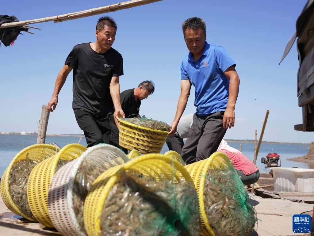 9月13日,養殖戶在河北省滄州市海興縣小山鄉蔡家莊村養殖蝦池搬運剛收獲的對蝦。
