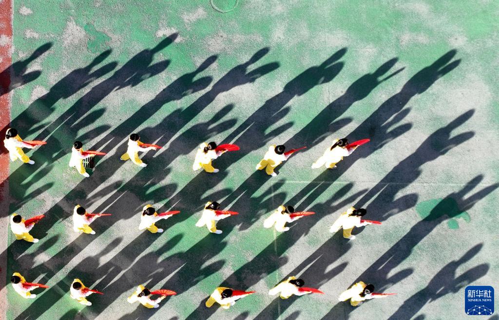 9月13日,在承德市雙橋區會龍山小學,學生練習太極扇(無人機照片)。