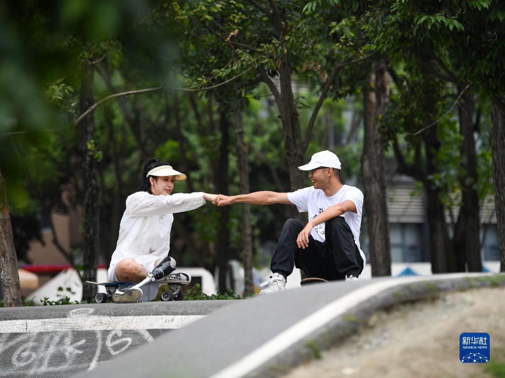 在成都市錦江區輕極限運動公園,胡月(左)和滑板愛好者在交流(6月20日攝)。新華社記者 王曦 攝