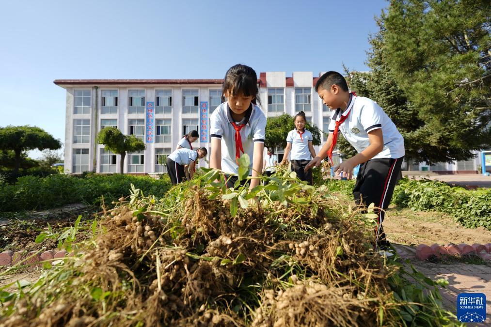 9月13日,河北省樂亭縣汀流河小學的學生在“校園農場”內收獲花生。