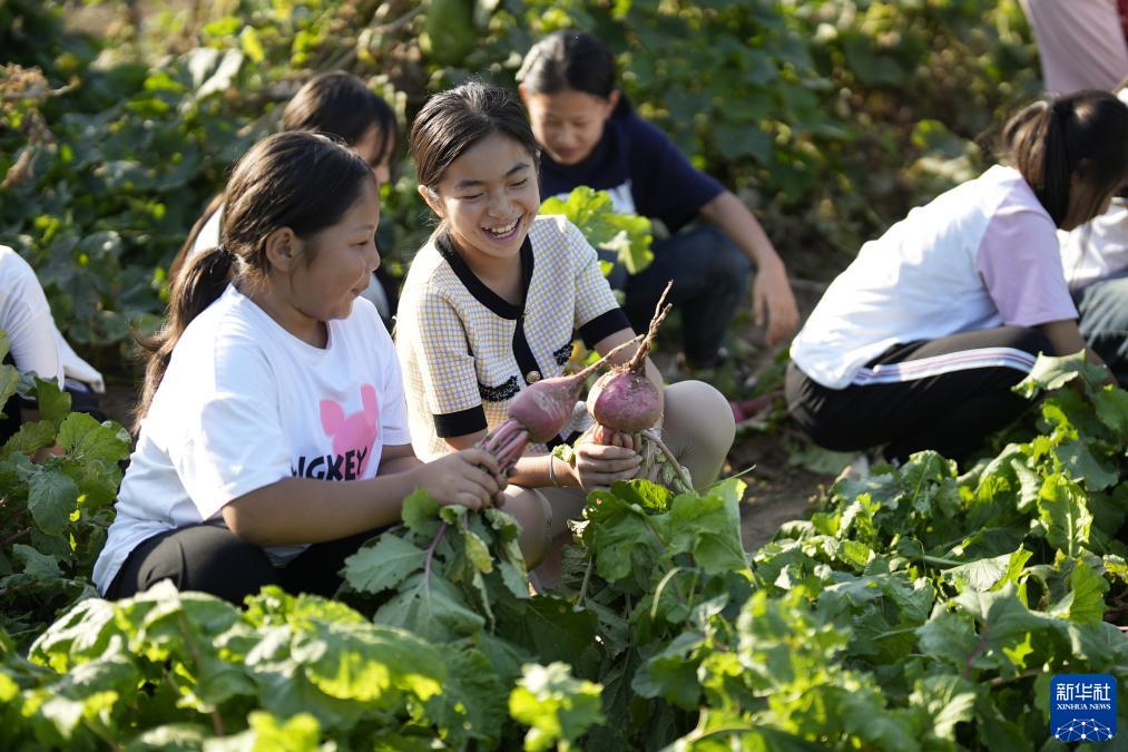 9月13日,河北省樂亭縣新寨鎮蘭坨小學的學生在“校園農場”內收獲蘿卜。