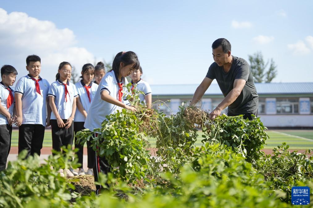 9月13日,河北省樂亭縣汀流河小學的老師在“校園農場”內指導學生收獲花生。