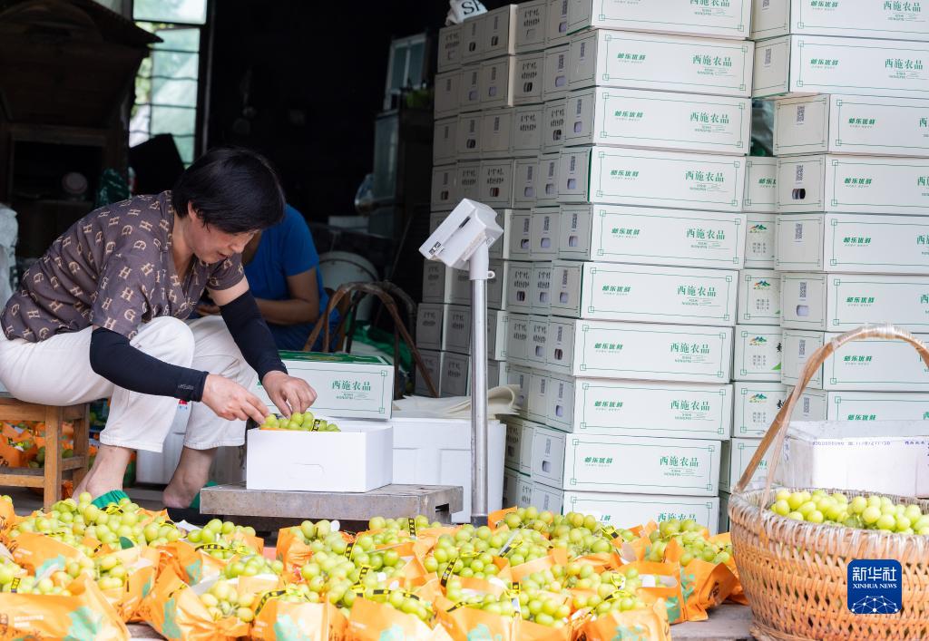 9月13日,浙江省諸暨市安華鎮五指山村的果農在給葡萄稱重、包裝。