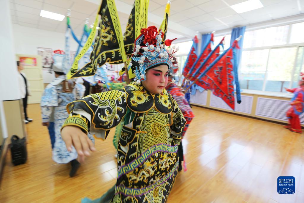 9月13日,在甘肅省定西市安定區福臺小學,戲曲社團的學生們在排練《秦腔聯唱》。