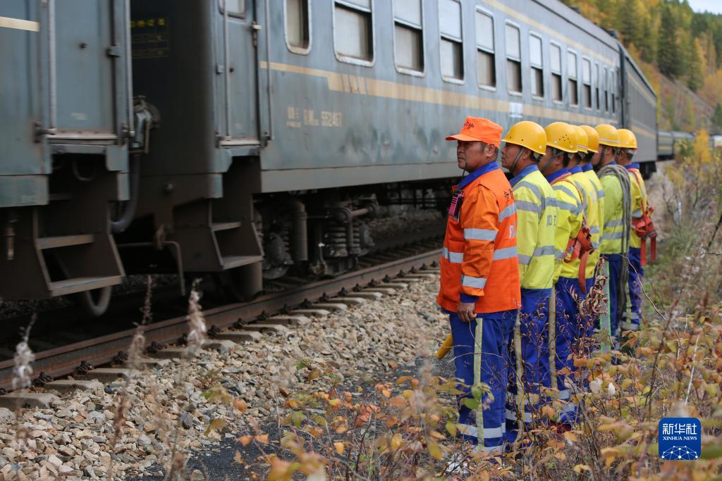 9月13日,中國鐵路哈爾濱局集團有限公司加格達奇工務段的鐵路工人在大興安嶺地區嫩林線等待火車通過。