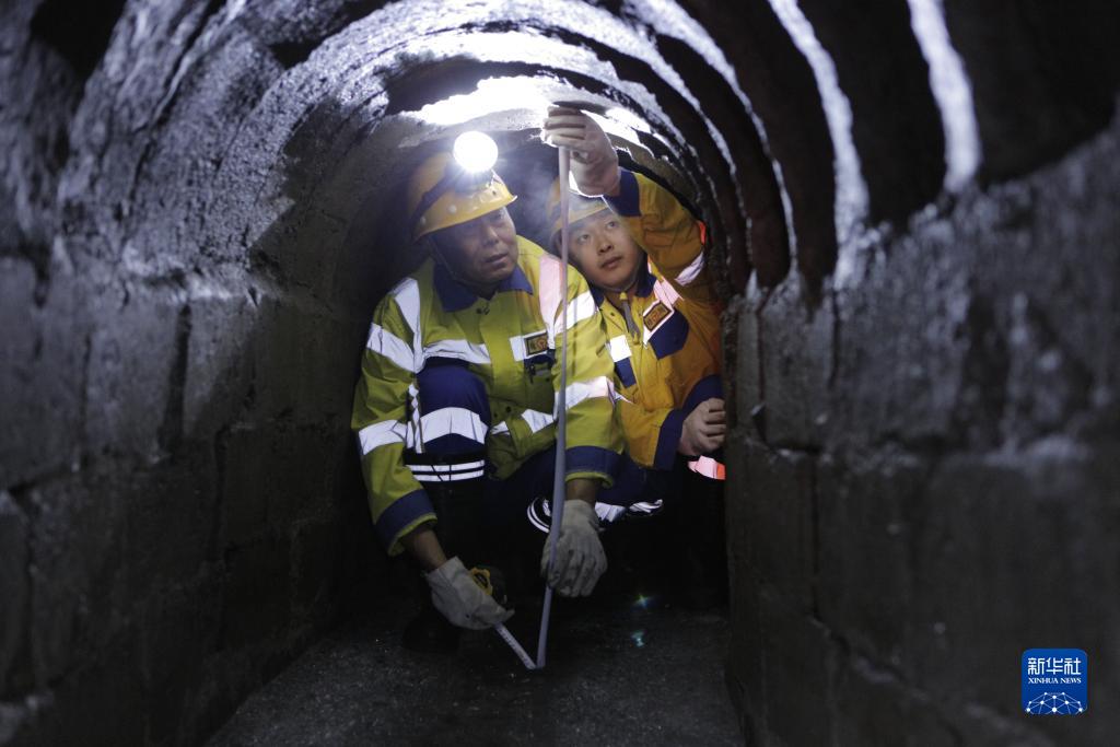 9月13日,在大興安嶺地區白卡爾隧道,中國鐵路哈爾濱局集團有限公司加格達奇工務段的鐵路工人在地下8米的深井檢查排水系統的暢通情況。