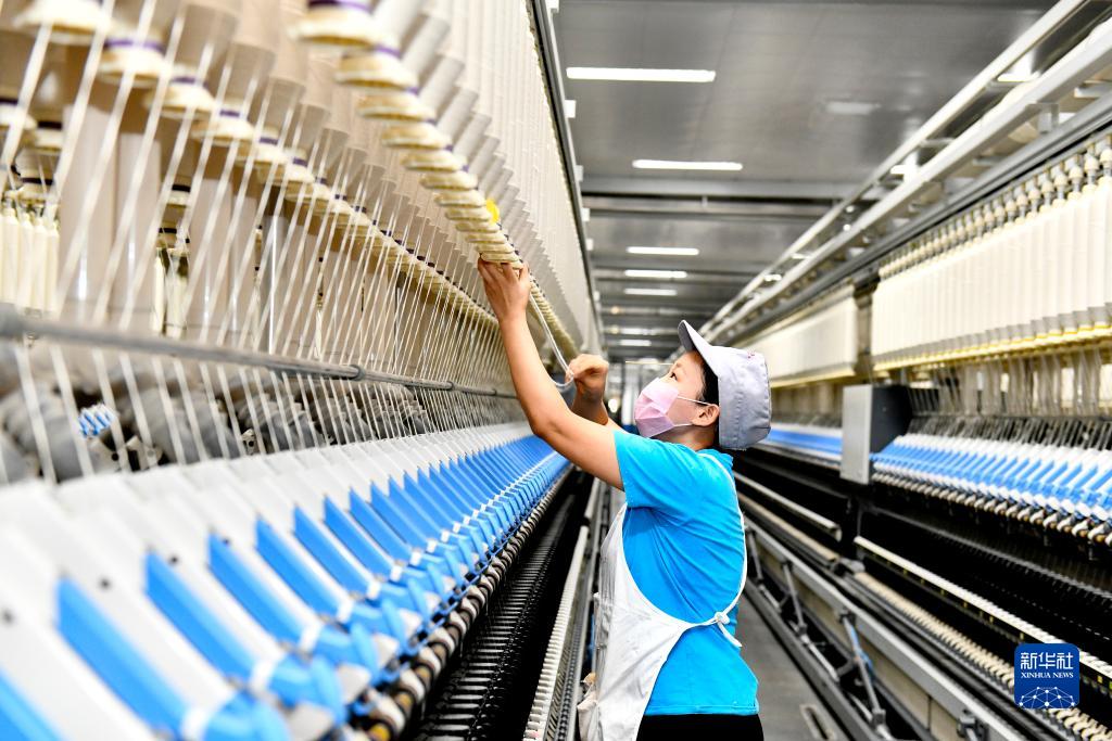 9月13日,在山東宏儒紡織科技有限公司綠色智能化生產車間,工作人員在加工高端紗線。