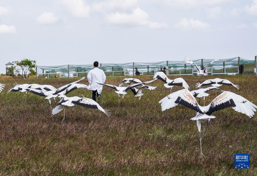 姜官宏對人工繁育的丹頂鶴進行野外放飛訓練(2022年11月8日攝)。新華社記者 季春鵬 攝