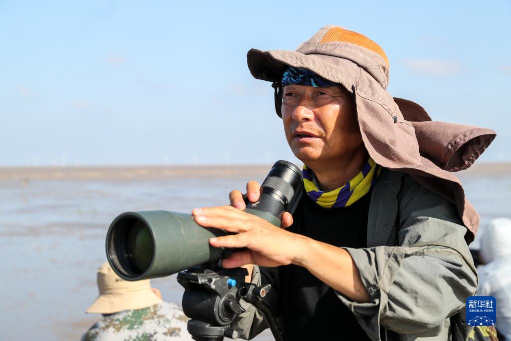 李東明(右)在東臺條子泥灘涂上調查拍攝鳥類(2023年8月19日攝)。鳥類調查員、攝影師李東明1963年出生,原本經營著一家圖文社,從2009年開始觀察、拍攝候鳥。2019年,他成為東臺條子泥濕地的一名鳥類調查員,起早摸黑,風吹雨打,通過攝影積累了大量圖片與視頻資料,更是多次觀察拍攝到全球僅剩600余只的勺嘴鷸,大家都稱他為“勺子王”“鳥博士”。目前條子泥濕地記錄的412種鳥中,他已拍到200余種。新華社記者 楊磊 攝