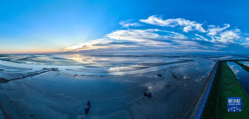 東臺條子泥濕地日出時分(2023年9月1日攝,無人機照片)。新華社記者 季春鵬 攝
