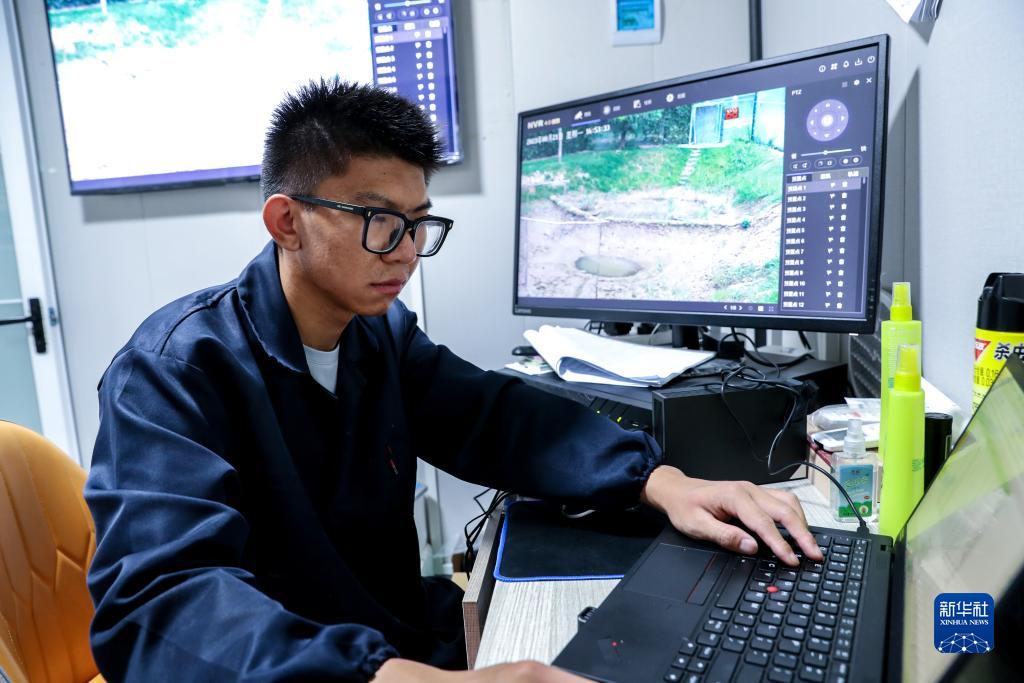 蔡新杰在紀錄朱鹮野化食物轉換的資料數據(2023年8月21日攝)。2000年出生的蔡新杰是江蘇鹽城國家級珍禽自然保護區鳥類研究中心丹頂鶴飼養員,目前在朱鹮野化放歸項目組工作,從事食物轉換實驗。新華社記者 楊磊 攝