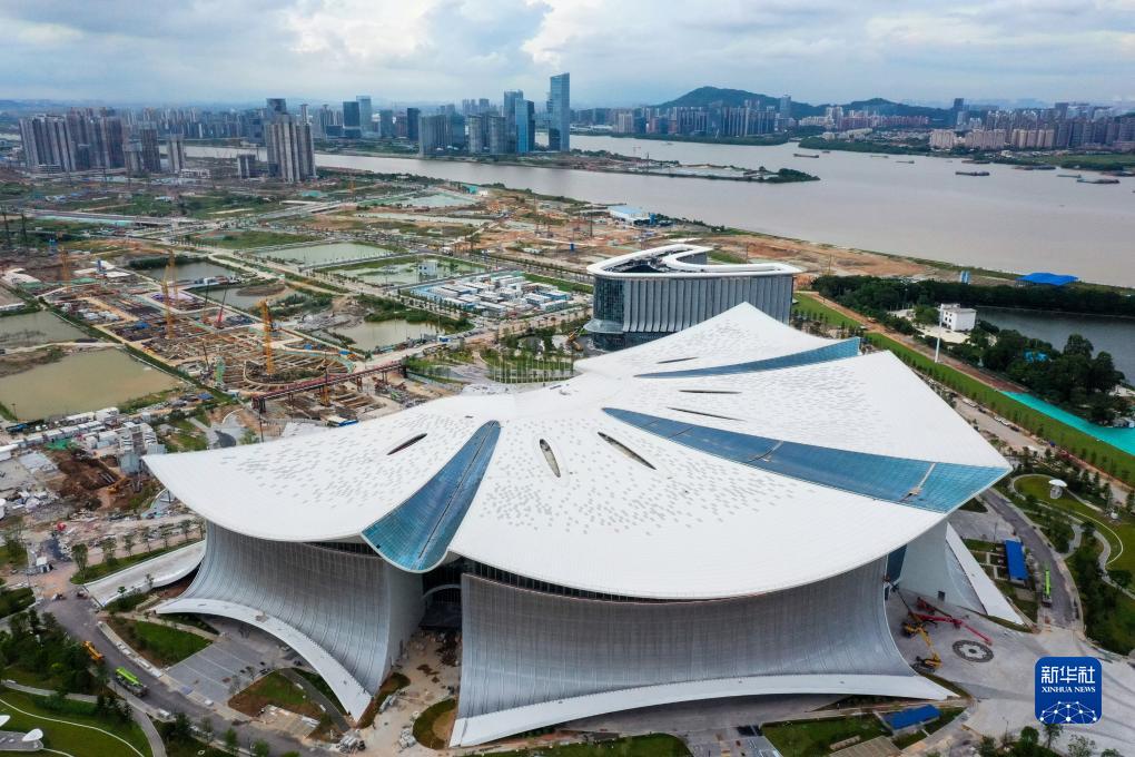 南沙國際金融論壇(IFF)永久會址屋面結構為空間桁架結構體系,以純白金屬屋面為“花瓣”,以玻璃采光屋頂為“花蕊”,共同構成一朵盛開的木棉花(無人機照片,9月13日攝)。