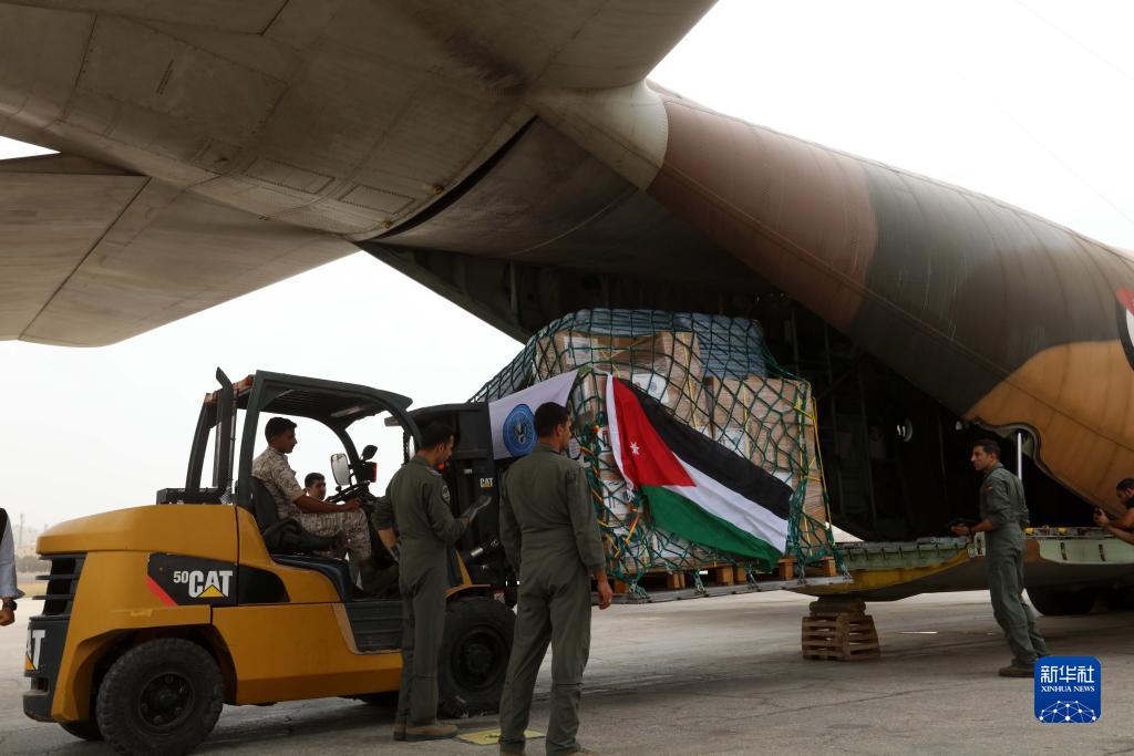 9月13日,工作人員在約旦安曼一軍用機場搬運援助物資。