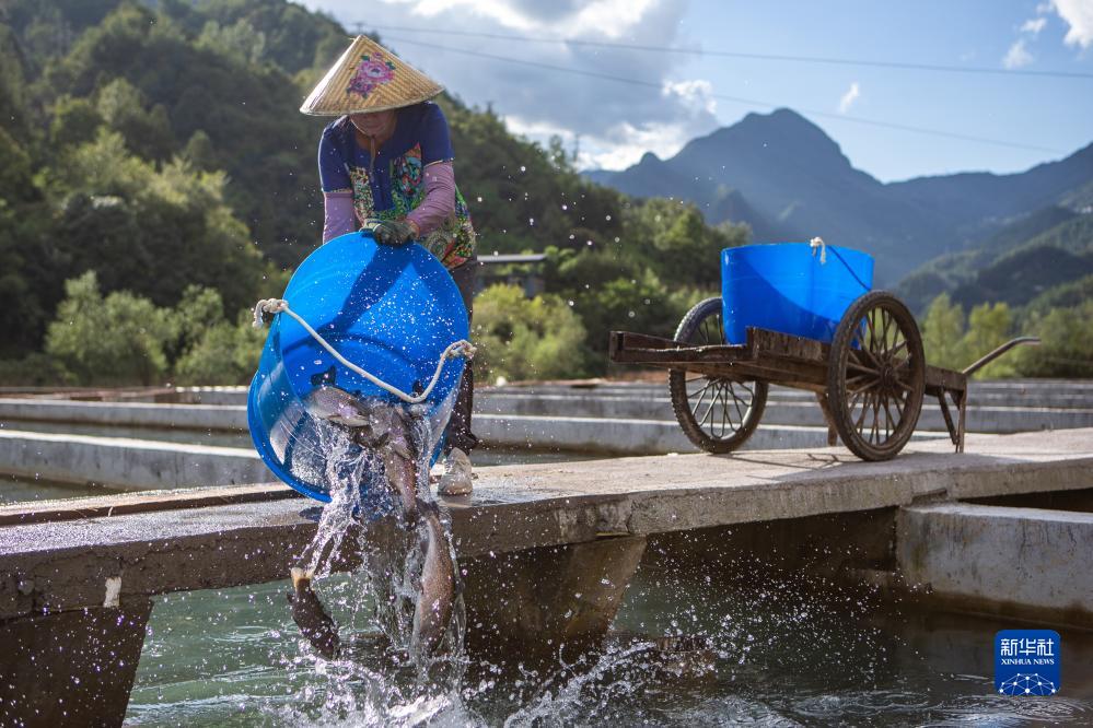 9月13日,在重慶市城口縣蓼子鄉明安村冷水魚產業基地,工人對分選的虹鱒魚進行換池。