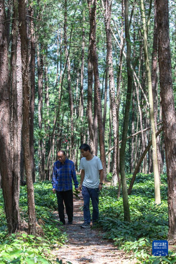 9月13日,在重慶市城口縣高燕鎮星光村箭葉淫羊藿種植基地,駐村第一書記馬凱軍(右)和駐村工作隊隊員蔡道武查看箭葉淫羊藿的長勢情況。