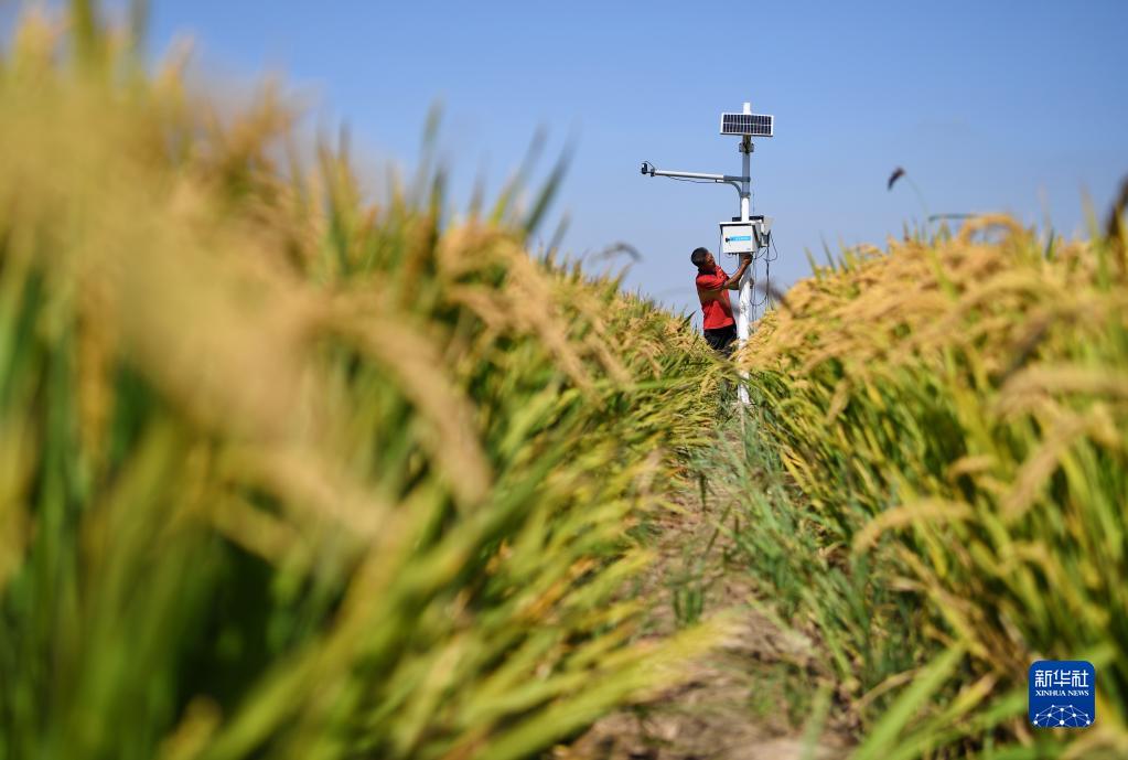 9月14日,在由鹽堿地改良而成的樂亭縣數字循環農業智慧園區,工作人員在調整水稻田監控設施。