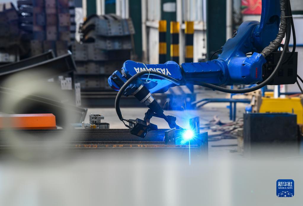 這是9月14日在渝湘高鐵重慶至黔江段站前3標智能化鋼構廠拍攝的型鋼拱架自動化生產作業現場。