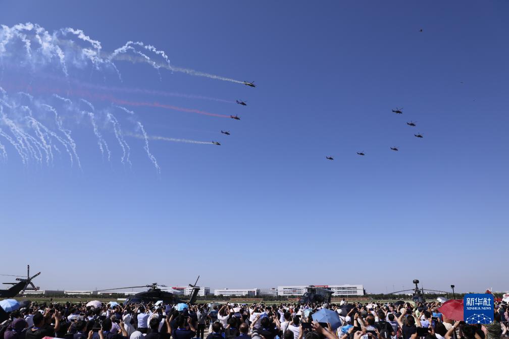 9月14日,在第六屆中國天津國際直升機博覽會開幕式上,陸軍“風雷”飛行表演隊進行通場飛行表演。