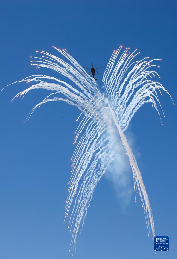 9月14日,在第六屆中國天津國際直升機博覽會開幕式上,陸軍“風雷”飛行表演隊直-20戰術通用直升機發射干擾彈。