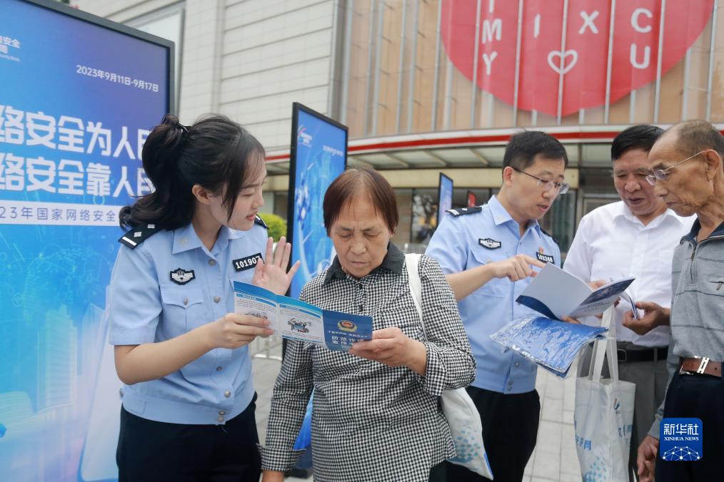 9月14日,在江蘇省揚州市邗江區雙橋街道的廣場上,民警向人們講解網絡安全和防范電信詐騙的知識。