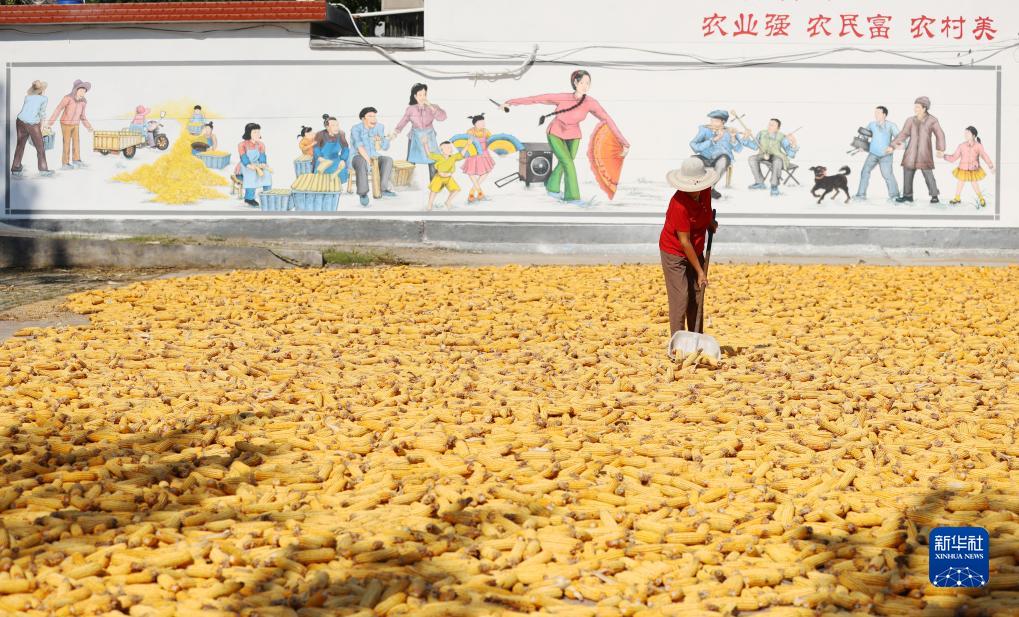 9月14日,山東省臨沂市郯城縣郯城街道東南村村民在晾曬收獲的玉米。