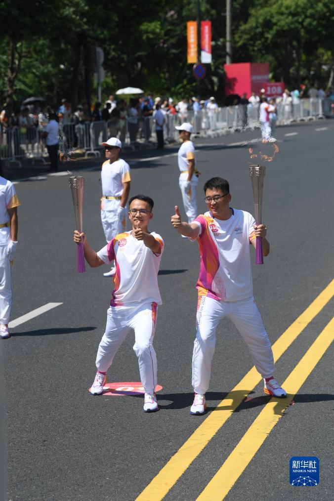 9月15日,火炬手陳永概(右)和何亦鑫在火炬傳遞中。