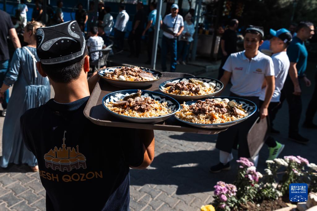 9月14日,在烏茲別克斯坦首都塔什干,工作人員運送抓飯。