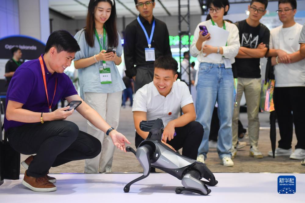 9月15日,參觀者在2023世界計算大會專題展上了解機器狗并與其互動。