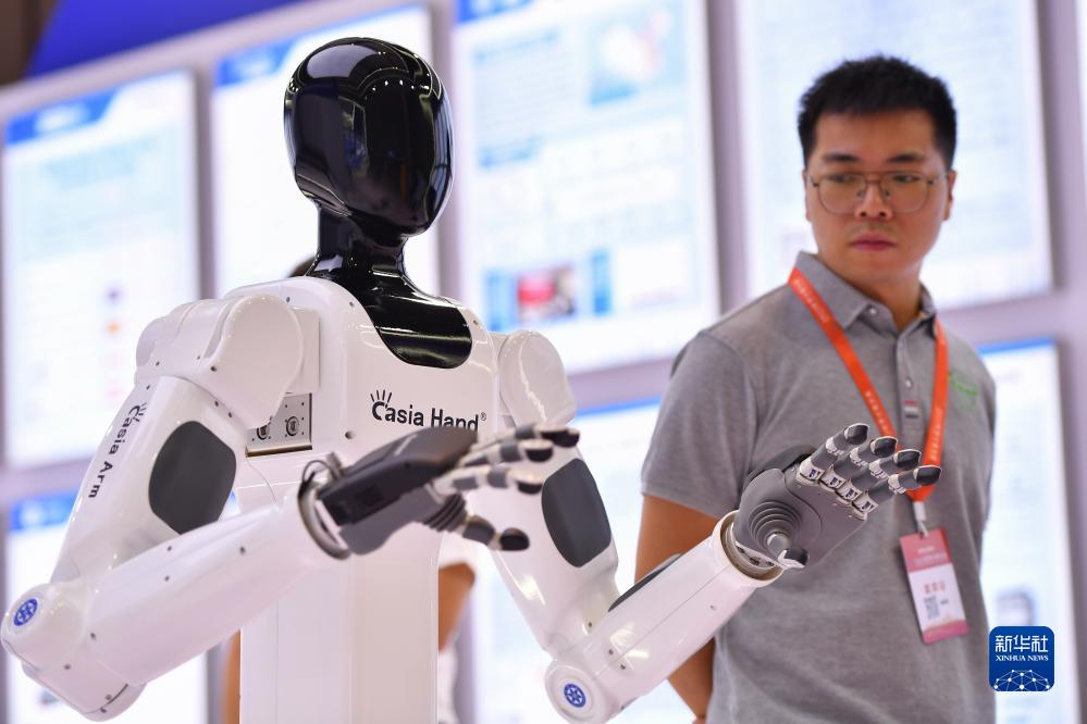 9月15日,參觀者在2023世界計算大會專題展上參觀服務機器人。