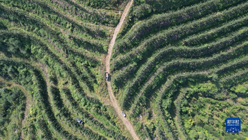 這是河北省玉田縣唐自頭鎮一處經荒山開發而建的果園(9月15日攝,無人機照片)。