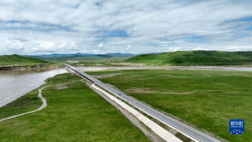 瑪曲縣城郊黃河岸邊的沙化帶已被牧草和灌木復綠(7月6日攝,無人機照片)。