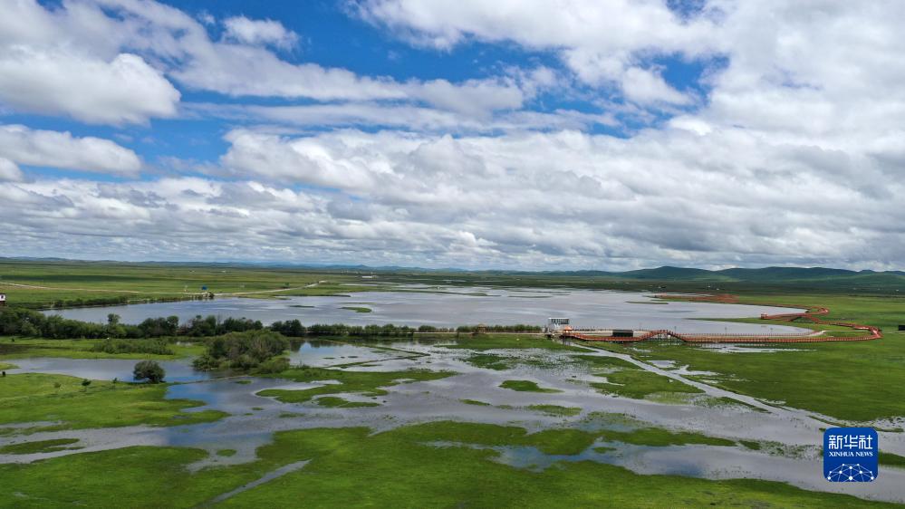 這是瑪曲縣河曲馬場的濕地草原景色(7月5日攝,無人機照片)。