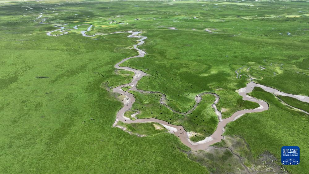 這是瑪曲縣阿萬倉濕地景色(7月6日攝,無人機照片)。