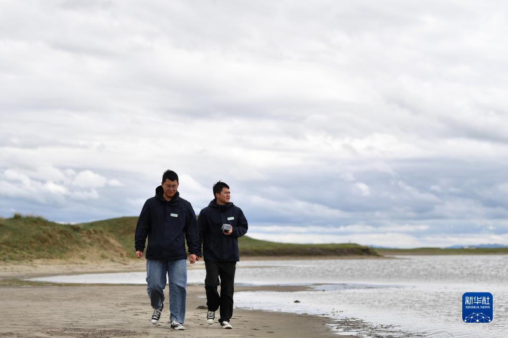 在甘南藏族自治州瑪曲縣,甘肅黃河首曲國家級自然保護區管護中心曼日瑪保護站工作人員王佳陽(左)和同事在保護區內巡護(7月5日攝)。