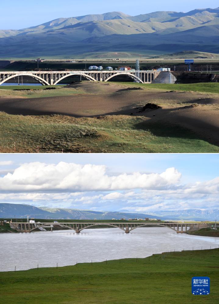 拼版照片:上圖為2011年6月10日在甘南藏族自治州瑪曲縣城郊的黃河大橋附近拍攝的大面積沙化退化草場(新華社記者聶建江攝);下圖為2023年7月6日在甘南藏族自治州瑪曲縣城郊的黃河大橋附近拍攝的沙化退化草場已經復綠(新華社記者陳斌攝)。