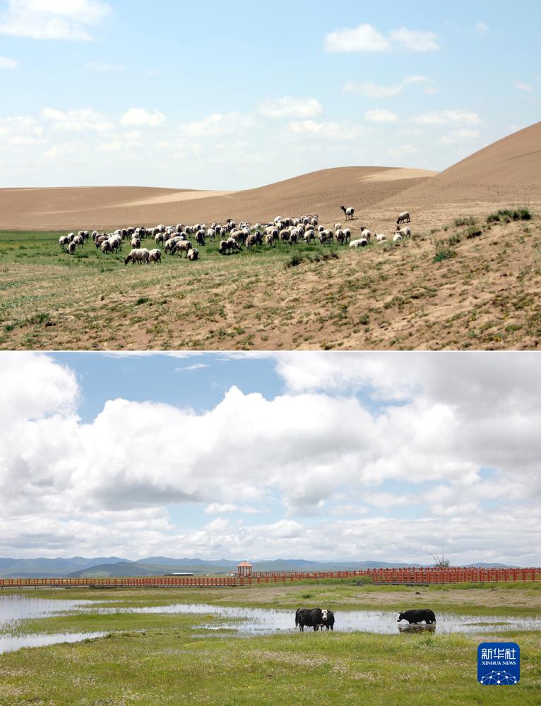 拼版照片:上圖為2004年7月19日,羊群在瑪曲縣一處沙化退化的草場上吃草,背后是大片流動沙丘(新華社記者宋常青攝);下圖為2023年7月5日牦牛在瑪曲縣濕地草原上吃草(無人機照片,新華社記者陳斌攝)。