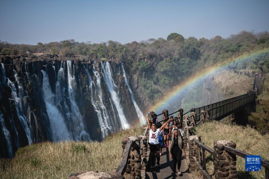 游客在贊比亞觀賞維多利亞瀑布景色(2023年8月21日攝)。