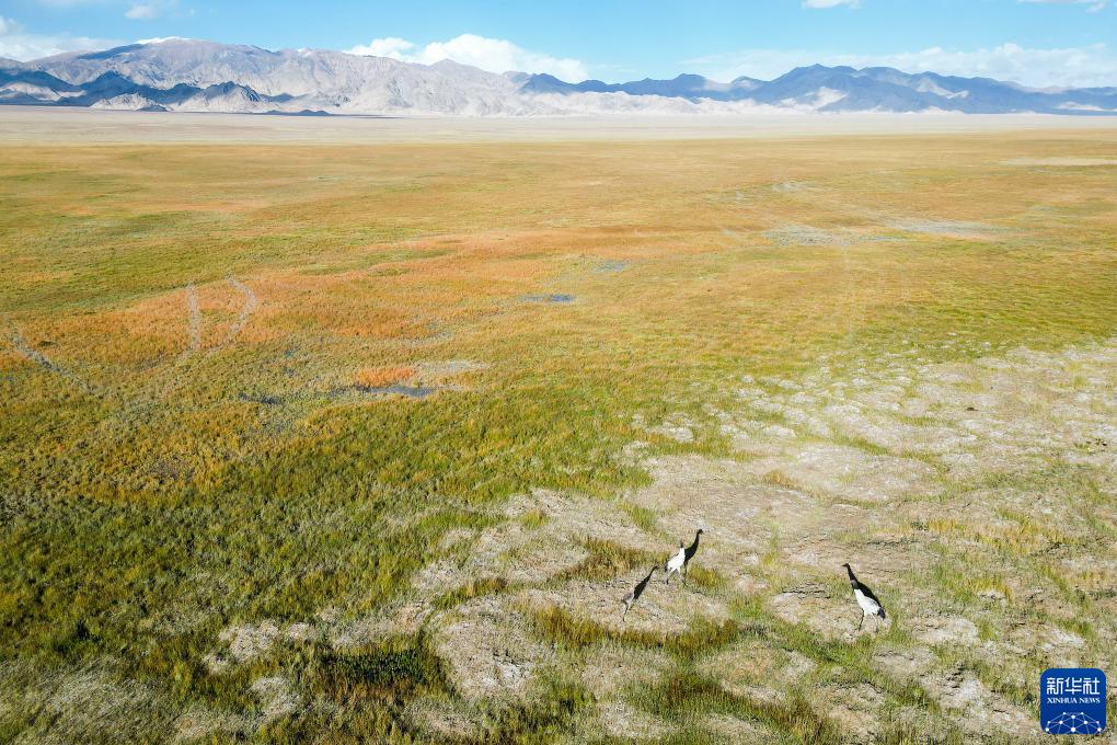 9月11日在阿爾金山國家級自然保護區拍攝的黑頸鶴(無人機照片)。