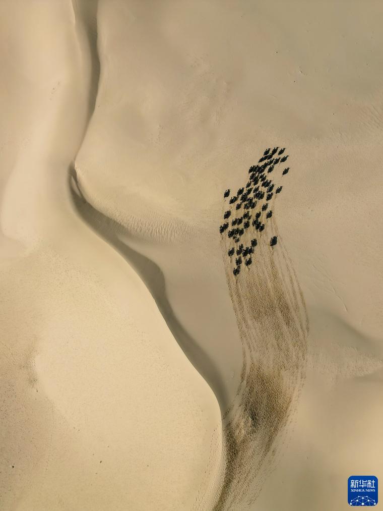 9月14日在阿爾金山國家級自然保護區庫木庫里沙漠拍攝的一群野牦牛(無人機照片)。