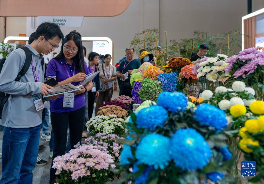 9月15日,參展商(左二)在第二十一屆中國昆明國際花卉展上為觀眾介紹花卉。