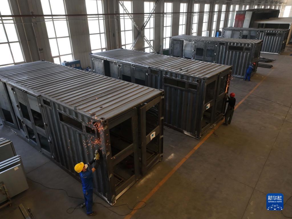 9月15日,工作人員在河北科源智能電氣有限公司生產車間對換電箱半成品進行打磨處理(無人機照片)。