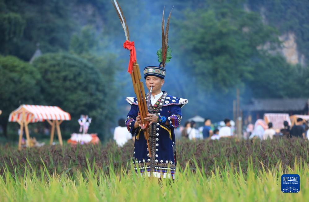 9月15日,民間藝人在張家界市武陵源區黃龍洞景區“田園市集慶秋收”活動現場表演。